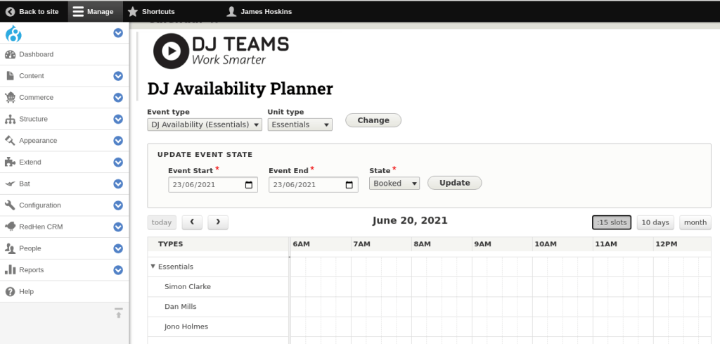 DJ Teams utilises Drupal’s native Booking and Availability Tools (affectionately known as BAT) and native CRM functionality called RedHen.