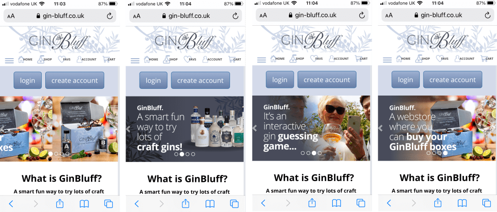 As the screenshots above suggest, the Gin-Bluff development is a mobile phone focused ‘progressive web application’ that incorporates digital marketing, eCommerce and interactive game elements.