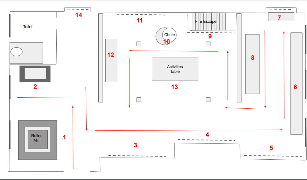 After walking around the space and studying the previous work that had been done back in the 1990s to envisage a working roller mill museum in another part of the enormous site, I came up with a proposal for topics and visitor flow that covered off all the key aspects of milling from the 1000 plus years of history at this location.