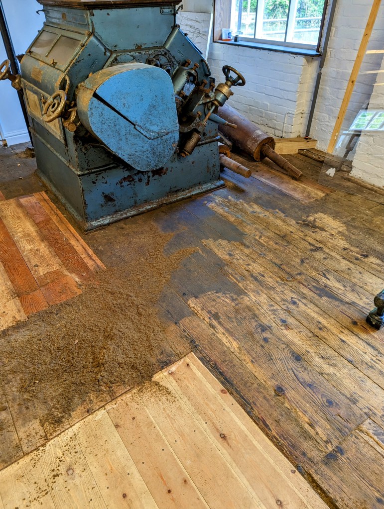 The oldest part of the mill is believed to date back to the mid 1600s. Therefore parts of the floor are likely to be over 300 years old. Wet rot, dry rot, woodworm and wear and tear have taken their toll on these oldest parts of the structure and different approaches to repairing it over the years have resulted in a patchwork of different surfaces. Other parts have been protected from the elements because of a thick layer of oil, flour and dirt that had been compacted on top.