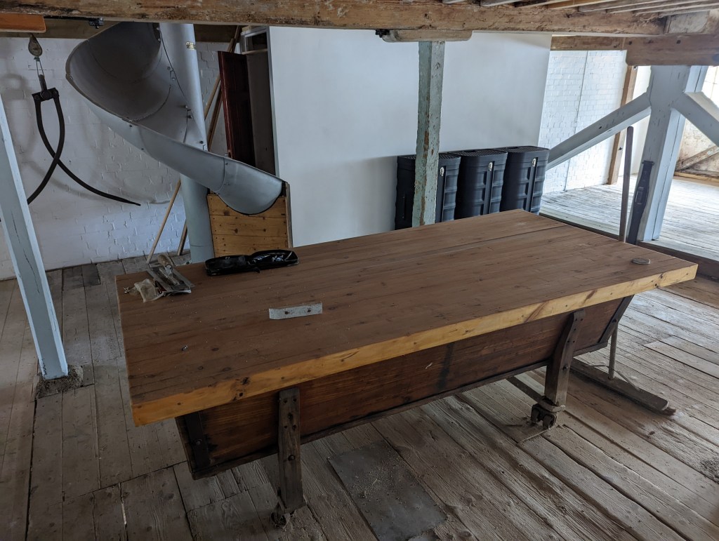 Another way we incorporated the old fabric of the building was using a section of the 100 year old wooden silo structure as an amazing top for something now described as the ‘activities table’. The underside of the table is a large wooden trough on wheels that was used for moving materials around in this part of the old mill.